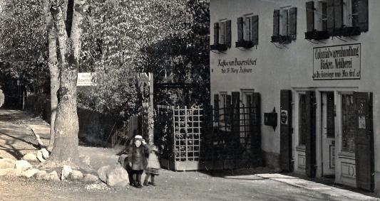 Rechts im Bild das heutige “Oskar Maria Graf Stüberl”, damals noch “Colonialwarenhandlung Bäckerei & Mehlberei (?) von Hans Hintersberger vormals Maxl Graf“. Daneben die Überraschung, ein Beweis, dass Berg damals schon Ausflugsort war: das “Kaffee zum Bauernstüberl Inh. Fr. Mary Hoffmann“, das damals im linken Teil des Graf-Hauses untergebracht war. Ganz klein erkennt man im Garten (rechts neben dem heute noch gedeihenden Baum) noch ein Schild “Kaffee Bauernstüberl”. Vor der Linde zwei schüchterne Mädchen.