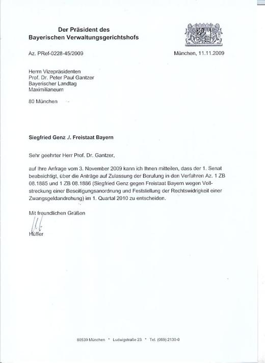 Vollstreckung einer Beseitigungsanordnung Er klagt also auch gegen den Bayrischen Staat … dieses Schreiben des Veerwaltungsgerichts dürfte ja wohl den Mörserturm betreffen. … Aber kann sich nach 14 Jahren des Prozessierens in unserer Gemeinde wirklich jemand vorstellen, dass der Berger Kaufmann und Gerneklager, der hier den Landtag beschäftigt, sein Türmchen abreißt, falls er auch im Einspruch gegen das Verwaltungsgerichtshofsurteil noch unterliegt? Muss dann die bayrische Armee mit Bulldozern das güldene Tor niederreißen und im “Staate Genz” einmarschieren? Und ist es ein Zufall, dass gerade jetzt – wo in der entnervenden Angelegenheit hoffentlich endgültig entschieden wird – die “genzerösen” Angebote kommen, das Windrad, das den Anwohnern seit Jahren auf die Nerven geht, abzureißen?