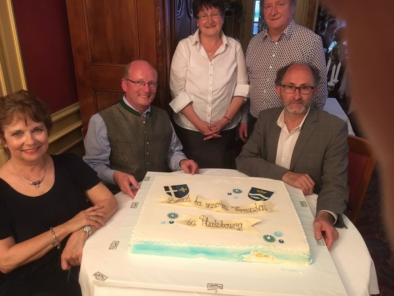 Gruppenbild mit Torte: Odette Gully, “adjoint au maire”, Bgm Rupert Monn, darüber Elisabeth Janes von den Amis de Berg und Richard Lauch, ebenfalls “adjoint au maire”, Bgm. Dany Kocher