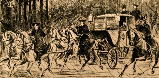 Gegen 4 Uhr nachts beginnt der Abtransport. Man fährt mit 4 Kutschen. In der dritten sitzt allein mit abmontierten Türgriffen der König.