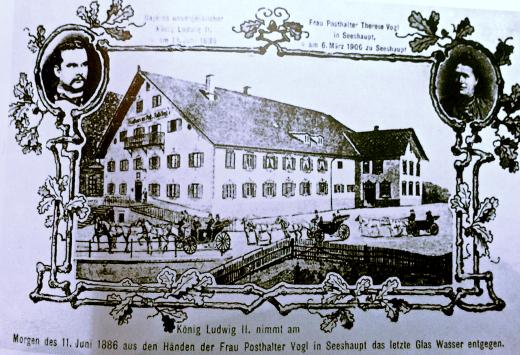 Unterwegs werden 2x in Peißenberg und Steingaden die Pferde gewechselt. Um 9 Uhr 45 gibt es im Wald zwischen Weilheim und Seeshaupt eine viertelstündige Toilettenpause für den König. Beim letzten Pferdewechsel in Seeshaupt unterhält sich der König mit der dortigen Gastwirtin Therese Vogl, die ihm ein Glas Wasser bringt. “Danke! Danke! Danke!” antwortet Ludwig und flüstert Therese noch etwas zu, was zu Verschwörungstheorien um eine mögliche Befreiungsaktion geführt hat. Das berühmte Trinkglas wird von der Familie noch lange aufbewahrt: