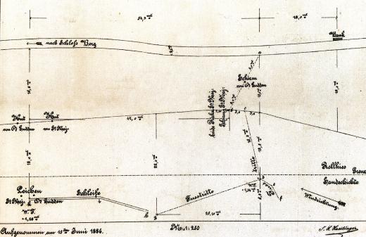 Die genaueste Skizze der Spuren am Unglücksort stammt vom Bezirksbautechniker Franz Xaver Haertinger, der den Ort als letzter untersuchte