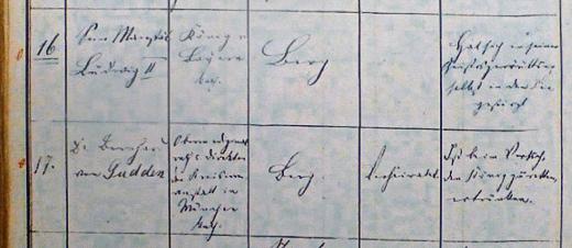 Auszug aus dem regierungstreuen Sterbebuch der Pfarrei Aufkirchen: unter No. 16 ist vermerkt: “Seine Majestät Ludwig II”, Beruf “König v. Bayern”, unter Todesursache rechts: “Hat sich in seiner Geisteszerrüttung selbst in den Tod gestürzt.” / Bei N.. 17 “Dr. Bernhard von Gudden” steht “Ist bei dem Versuch, den König zu retten, ertrunken.”