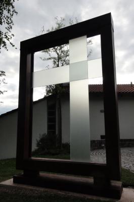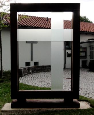 Die sakrale Komponente, die hier im Kontext der evangelischen Kirchengemeinde schneller ins Bewusstsein drängt als bei einer Positionierung der Skulptur in einer Landschaft, war vom Künstler zunächst gar nicht intendiert. Er fand hauptsächlich die Ausschnitte interessant. Doch eines Tages um fünf Uhr morgens, als die Sonne die Glasscheiben von hinten beleuchtete, wurde die Kreuzsymbolik mit aller Macht offenbar, und Roman Woerndl wurde plötzlich bewusst, “was für ein sakrales Teil das ist”.