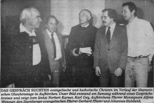 Archivfund mit Monsignore Wimmer (mitte, Aufkirchen); rechts daneben der ehemalige evangelische Pfarrer Pfister, der den Bau des Gemeindehauses entscheidend vorantrieb und ganz rechts Pfarrer Johannes Habdank als junger Mann (rechts)