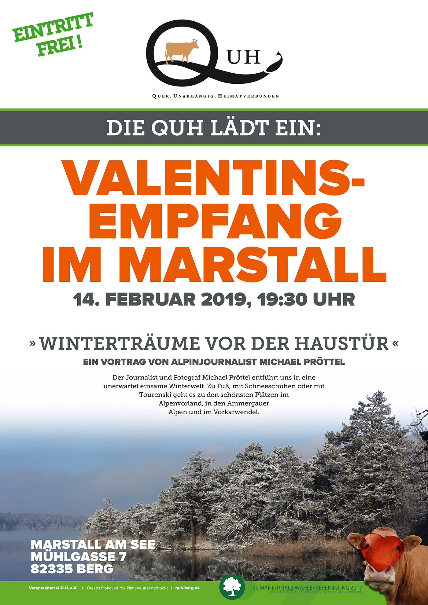 Falls nur ein Gast kommt, ist die Halle schon bereitet … falls noch ein paar mehr kommen, putzen wir schon einmal die Gläser und stellen – optimistisch wie wir sind – noch ein paar Stühle mehr auf: Die QUH lädt heute 14.2. am Tag der Liebe zum Valentinsempfang mit Sekt, Vortrag und Gesprächen … Eintritt frei, Unterhaltung garantiert.