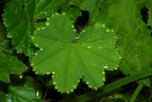 Michael J. Stiegler schreibt dazu: “Das Foto zeigt das Blatt eines Frauenmantels (Gattung Alchemilla), das überschüssiges Wasser an speziellen Poren ausscheidet. Der Vorgang nennt sich Guttation und erklärt die regelmäßige Anordnung der Wassertropfen.”