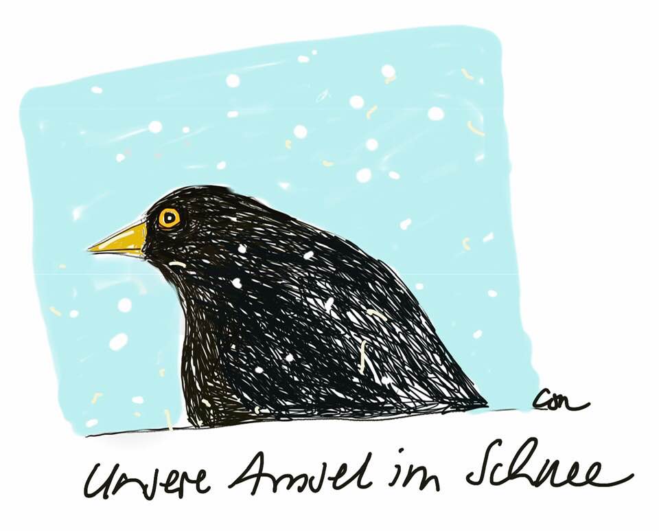 Kurzum, die Welt ist gerade wie verwandelt … einzig unser QUH-rikaturist Volker Cornelius macht uns etwas Sorgen, der statt der üblichen QUH plötzlich eine Amsel aus seinem Garten portraitiert hat:
