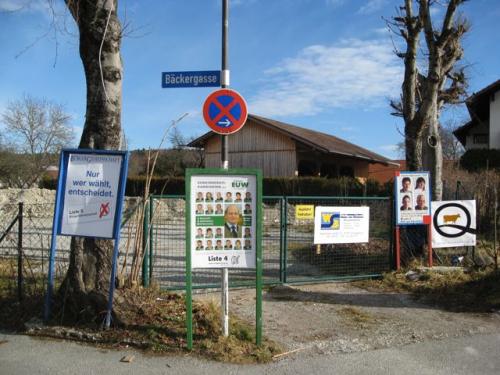 Der Berger Dorfplatz, an dem sich eindrucksvoll der Gestaltungswillen des alten Berger Gemeinderates in seiner ganzen “weitblickenden” (s.u.) Pracht zeigt, ist kurzzeitig etwas freundlicher geworden. Von ihren Plakaten lächeln die Gemeinderats-Kandidaten herab.