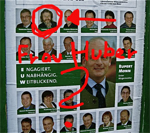 Heidi Huber aus Bachhausen ist u.a. aktiv im Schützenverein. Die “Engagiert Unabhängingen Weitblicker” fanden sie politisch so engagiert, dass sie sie auf den sicheren Platz 2 für den Gemeinderat setzten. (vgl. EUW: http://www.einigkeit-berg.de/EUW_Newsletter_Dez2007.pdf ). Auf dem aktuellen Plakat der EUW hat ihren Platz allerdings Ludwig H. übernommen, der so weit blicken wollte, dass er im Gemeinderat allen Ernstes für eine Sternenwarte auf dem Mörserturm von Hrn. “Schwarzbauer” Genz stimmte. Frau Huber ist von der Liste verschwunden. Ein Ersatzkandidat musste nachrücken. Hoffentlich ist nichts Schlimmes passiert. Jetzt finden sich auf den vorderen 11 Plätzen der “Einigkeit” 10 weitblickende Männer. Was wurde aus Frau Huber? Eine Spitzenkandidatin verschwindet. SZ und Merkur übernehmen Sie!