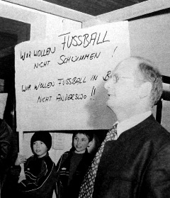 Es war vor langer Zeit, genau am 13.3.2003. Vor dem Rathaus fand eine unangemeldete Demonstration statt: Die Jugendmannschaften des MTV Berg protestierten vor dem Rathaus gegen die bekannt schwierigen Trainingsbedingungen beim MTV: Ein hügeliger, ständig überschwemmter, zu kleiner Trainingsplatz für gut ein Dutzend Mannschaften (9x Jugend, 1x AH, 1.& 2. Mannschaft).