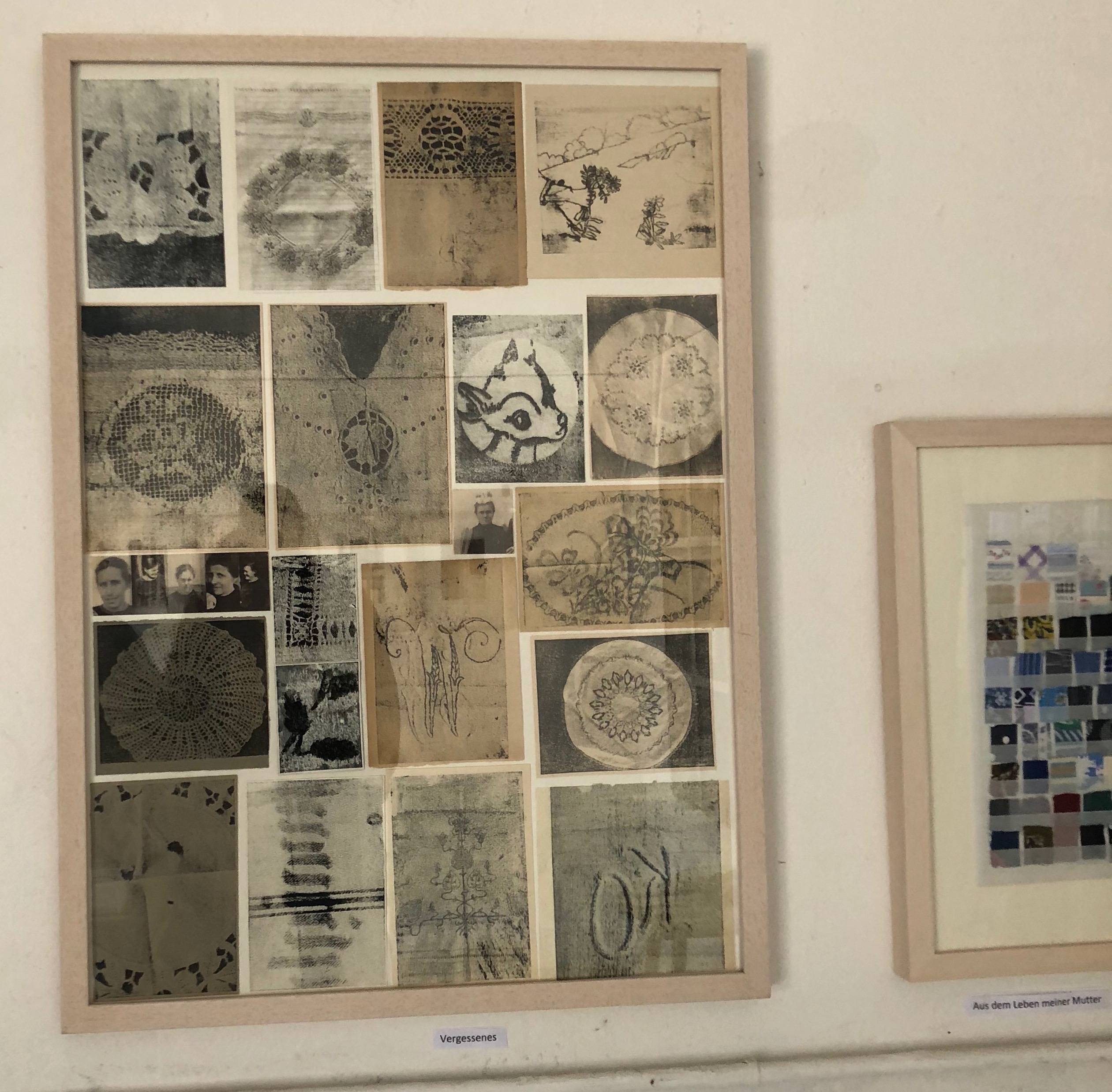 Die ehemalige Hauswirtschaftslehrerin hat zum Thema “Vergessenes” alte Stoffe und Muster zusammengestellt – was wir hier sehen, ist eine sogenannte “Transferlithographie”, ein Ausdruck, der ihr gar nicht gefällt. Daneben, nur angeschnitten, sehen Sie gerahmte Stoffstücke mit dem Titel “Aus dem Leben meiner Mutter”. Genähte Werke mit dem Titel “Mutterkorn” hängen ebenfalls im Raum, und auf gar keinen Fall versäumen sollen Sie es, die kleinen unscheinbaren Heftchen auf dem Tisch durchzublättern, die teilweise schon von 2002 stammen. Katharina Bocksberger hat darin Zeichnungen und Collagen zum Beispiel von Staubsaugern oder Staubsaugertüten versammelt. Sehr gut hat uns das gefallen.