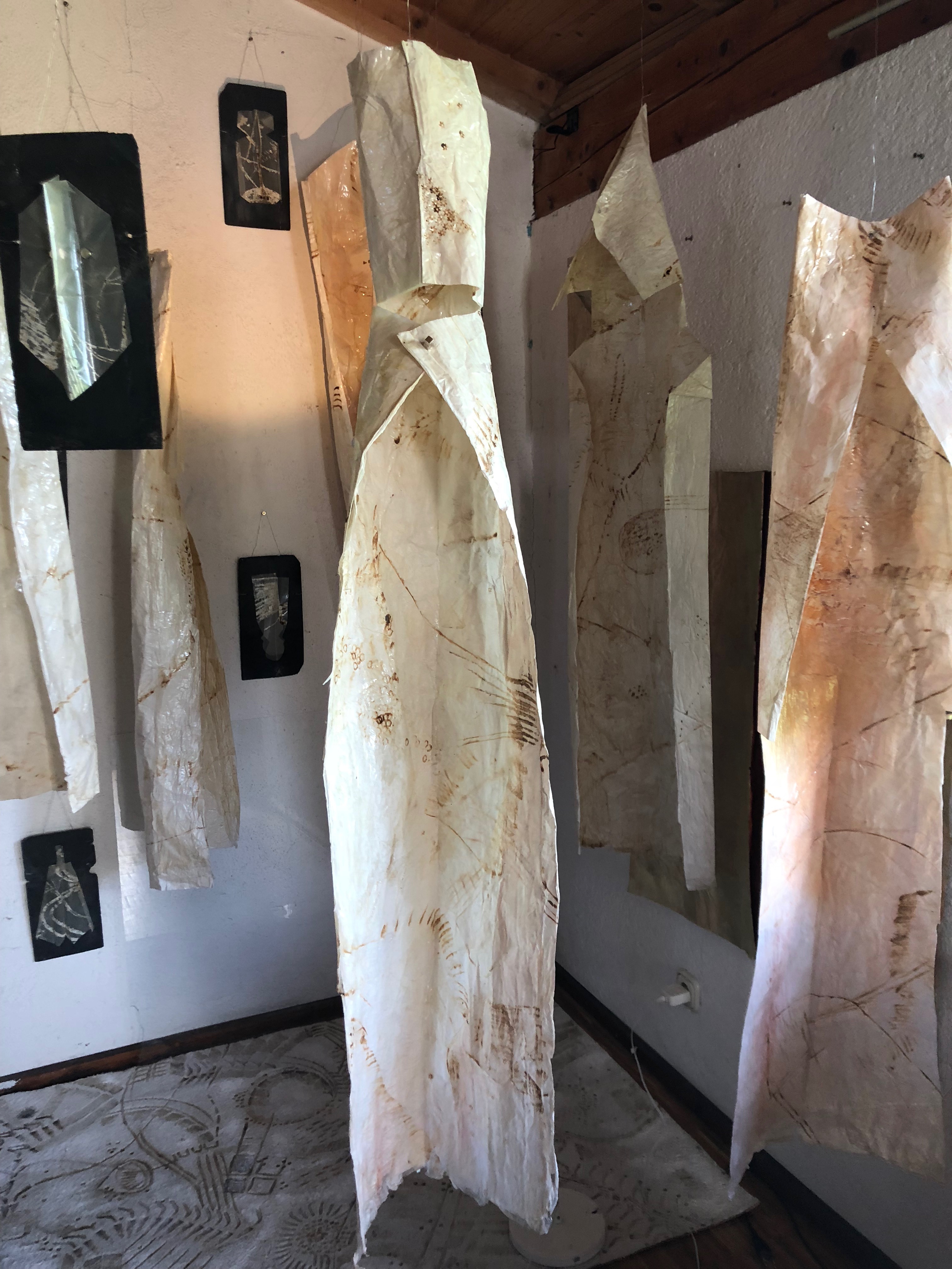 Lucie arbeitet gerne mit Papier – so machte sie etwa zum 100-jährigen Geburtstag von König Ludwig “Königsmäntel” aus Seidenpapier, das sie mit Kleister versteifte, oder auch Engel. Diese Mäntel, beinahe in Vergessenheit geraten, fielen ihr nun wieder ein – und man darf sie in neuer Gestalt als “Vergessene Seelen” in ihrem Atelier bewundern.