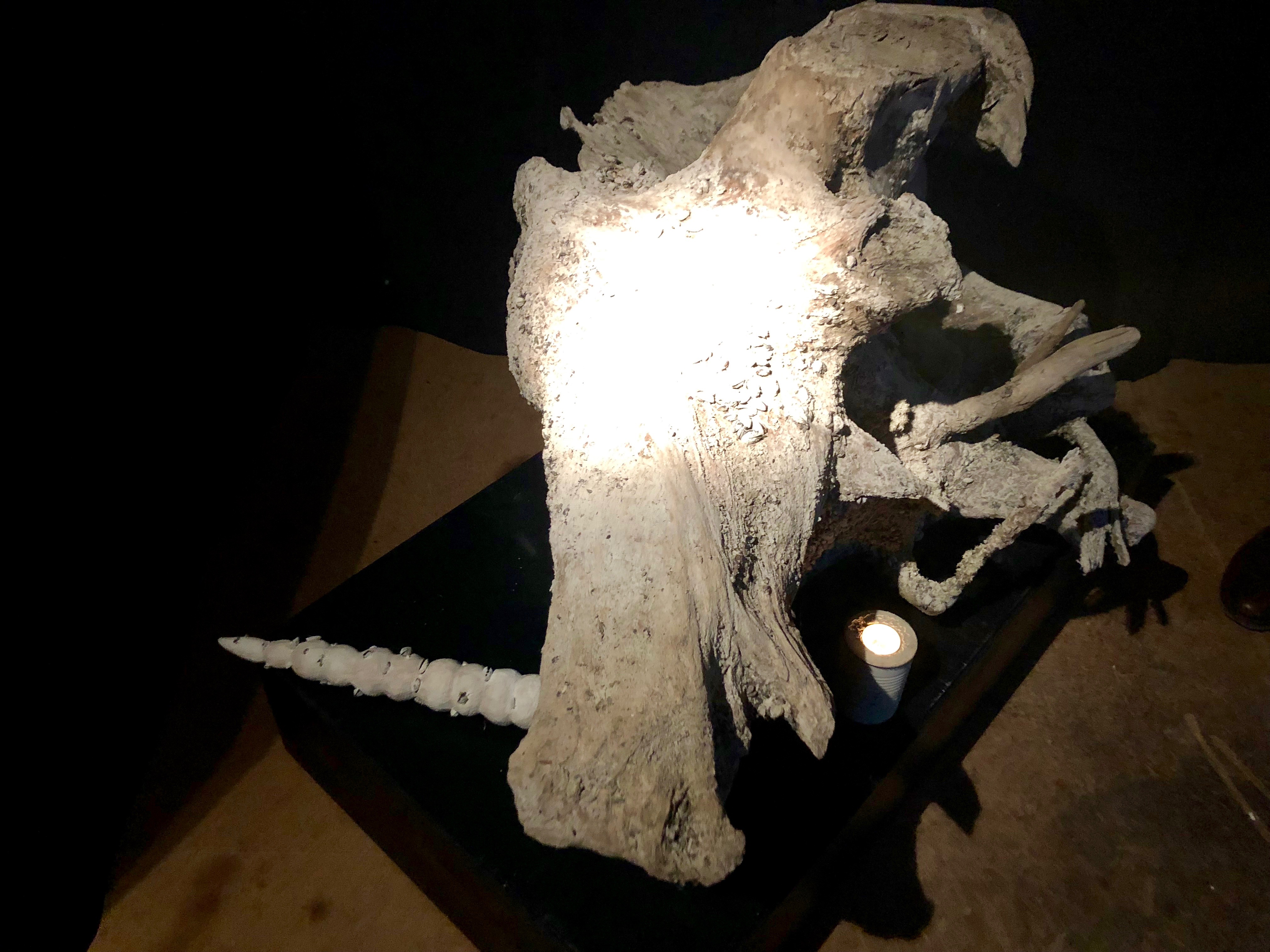 Wie ein besonderer Schatz in einem Naturkundemuseums verbirgt sich hinter dem schwarzen Vorhang das aus großen Tiefen geborgene “Starnberger Unterwassereinhorn” – in der langen Zeit seit seinem Aussterben haben sich schon Muscheln daran festgesetzt. Das Horn selbst ist leider abgebrochen, wurde aber glücklicherweise mit aufgefunden und hochgetaucht. Und das ist natürlich kein Fake – so wie Damian Hirsts aus dem Meer geborgene mythische Gestalten auf der Biennale in Venedig im letzten Jahr!