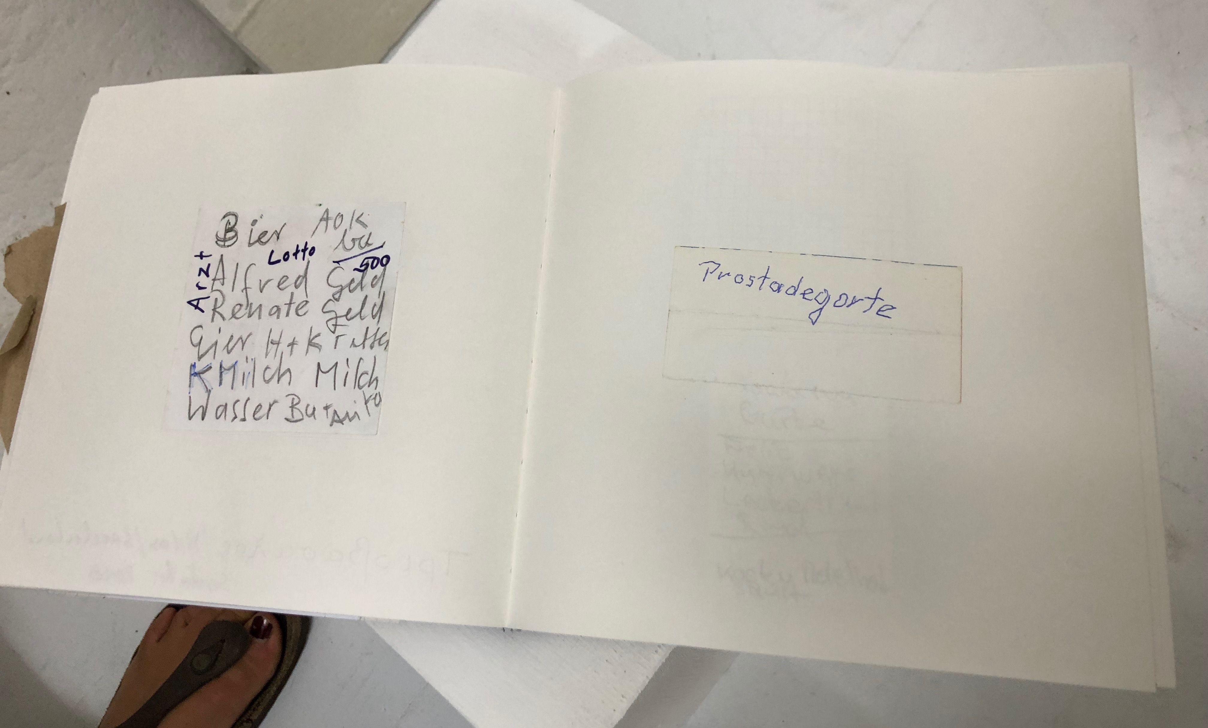 Ein konzeptuelles “Work in progress” ist das Buch mit vergessenen Einkaufszetteln aus einem Berger Supermarkt. Kassiererinnen sammelten auf Hansens Bitte hin in Einkaufswagen liegengebliebene Zettel, die geschrieben wurden, um nur nichts zu vergessen – ein großartiger Spiegel des Lebens in Berg, auch mit einigen Zetteln in fremdländischen Sprachen und Schriftzeichen.