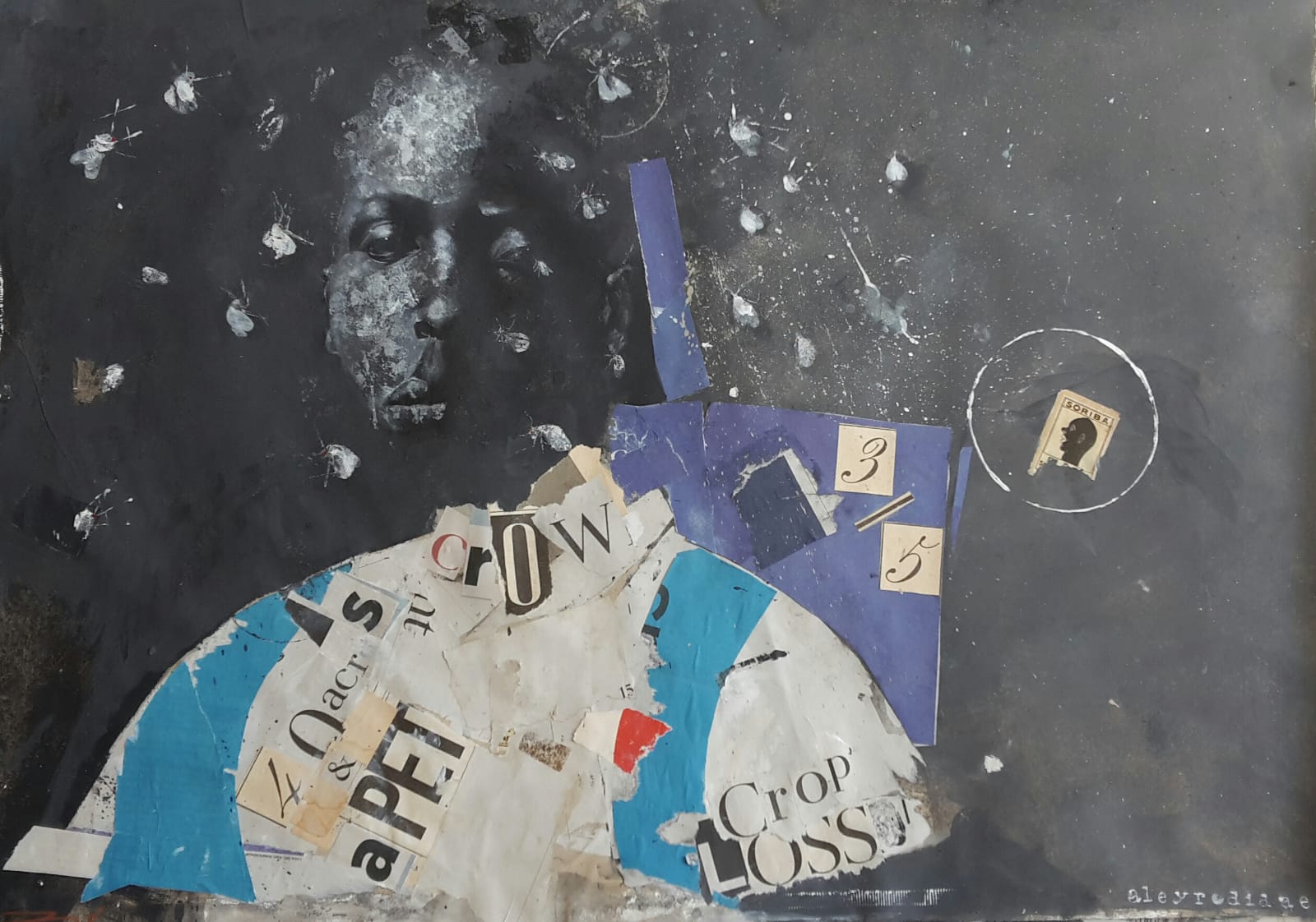Tre Polks neuestes Werk passt gut zum Thema, erklärt er. Es trägt den lateinischen Namen für Mottenschildläuse, auch Weiße Fliegen oder “white flies” genannt. Diese Weißen Fliegen stellen eine große Gefahr für die Ernte (crop) dar. Hier umschwirren Sie, aus dem Rucksack voll mit dem Schulstoff der Weißen, den Kopf des schwarzen Jungen – dessen Hemd mit Anspielungen auf die amerikanische Geschichte gespickt ist: Jim Crow (Anspielung auf die Jim-Crow-Gesetze zur Rassentrennung), das vergessene Versprechen von 1865, jeder ehemalige schwarze Sklave bekomme 40 Acres Land (16 ha) und dazu ein Maultier … Es ist nicht das einzige Bild von Tre Polk im Atelier – er zeigt sie Ihnen gerne.