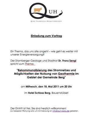 Begleitend dazu gab es in der letzten Sitzung einen Antrag von QUH, SPD, FDP und Grün, die Möglichkeit der Gründung eines kommunalen Energiewerkes zu prüfen (“Rekommunalisierung”). Dazu hat die QUH für den Mittwoch Abend den Starnberger Stadtrat und Geologen Dr. Franz Sengl zum Thema: “Rekommunalisierung des Stromnetzes und Möglichkeiten der Nutzung von Geothermie im Gebiet der Gemeinde Berg” eingeladen. Der Vortrag findet im Bauernstüberl des Hotels Schloss Berg statt und beginnt um 20 Uhr.