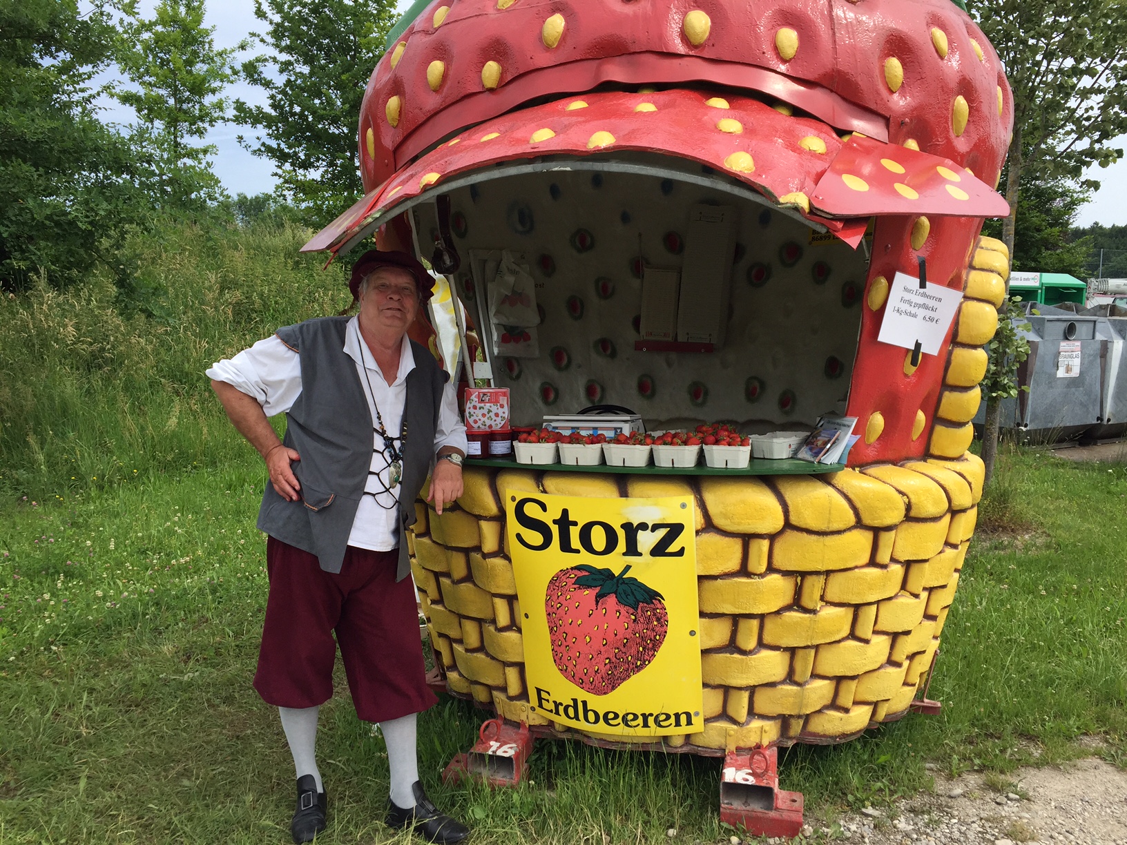 Hans Rohe alias Topolino verkauft sein letztem Jahr Erdbeeren für die Firma Storz. Noch länger, nämlich seit sieben Jahren, ist er Märchenerzähler – und die zugehörige Märchenerzählerkleidung präsentiert er auch gleich beim Erdbeerverkauf. Zum ersten Mal steht der Stand hier in Berg gleich neben dem Kreisel vor den Altglascontainern. Herrn Rohe alias Topolino kann man buchen: http://www.der-maerchendichter.de/ Für Geburtstagsfeiern, Firmenfeste, Kinderevents steht er zur Verfügung.