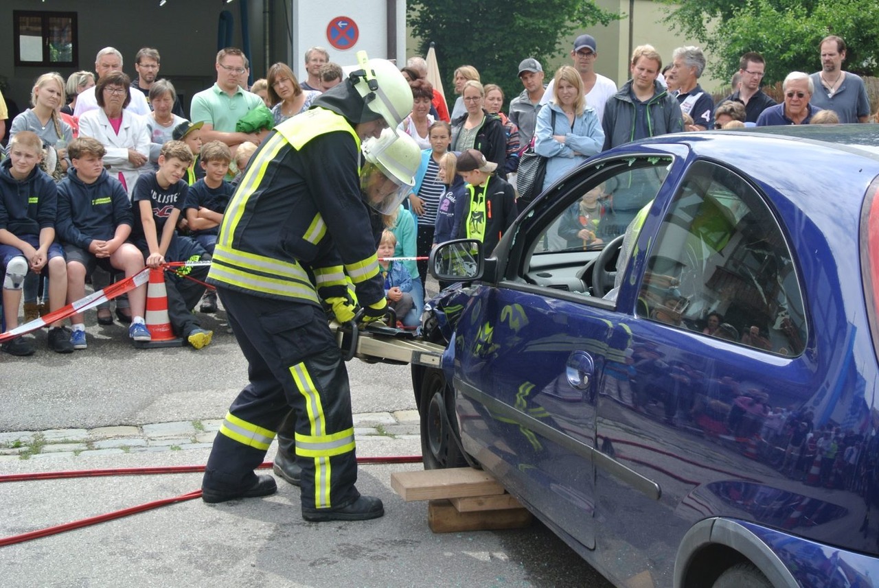 Highlight des Tages war die Rettung einer Person aus einem verunfallten Wagen. Das freundlicherweise bereit gestellte, nicht mehr fahrtüchtige Auto wurde mittels Schere und Spreizer schnell zerlegt, sodass die Person (in diesem Fall natürlich eine Puppe) achsengerecht und schonend befreit werden konnte.