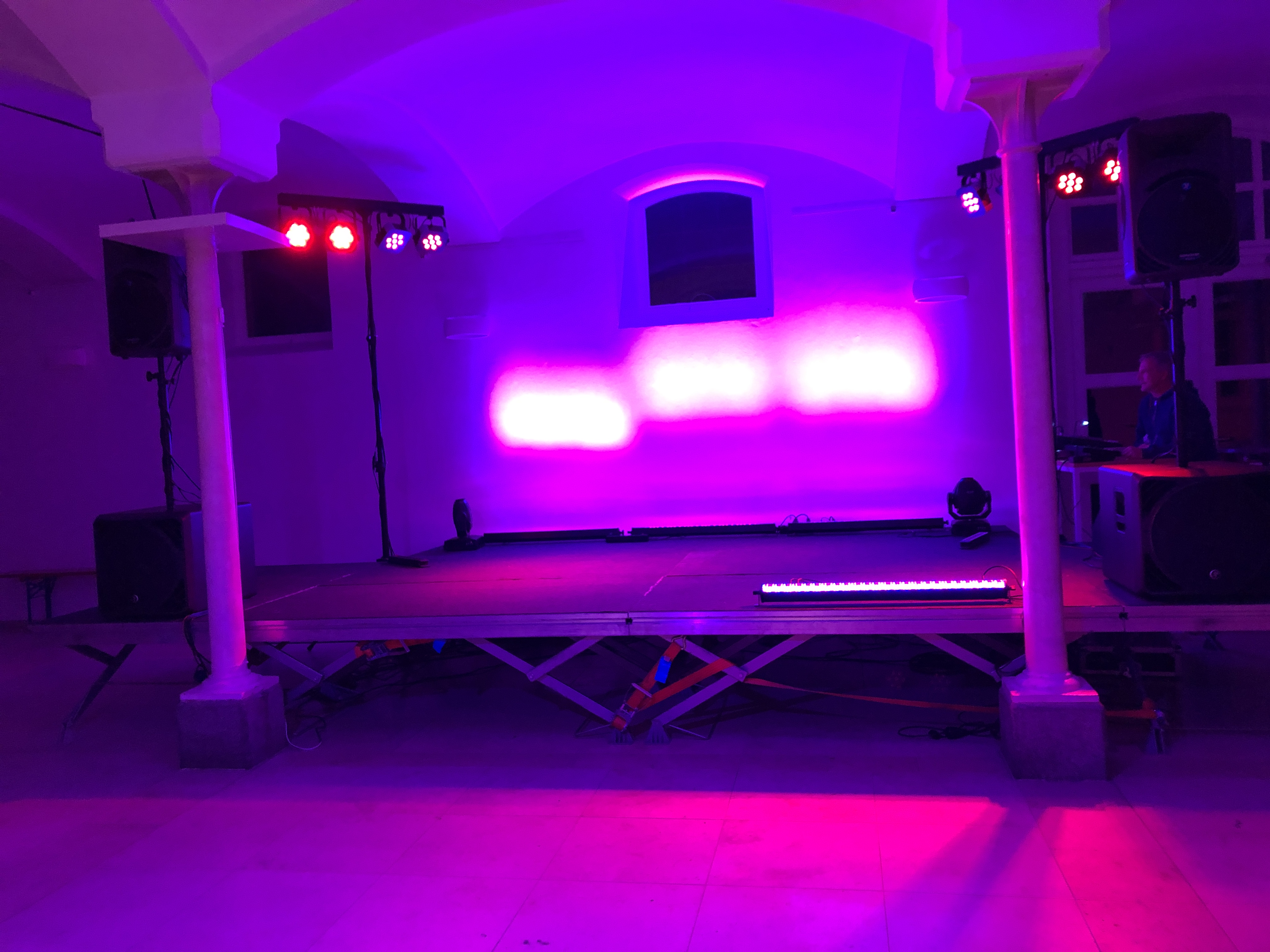 … Jörn Kachelriess hat Licht und Ton gewohnt klasse installiert. Fleißige Helfer haben schon Bühne, Tische und Bar aufgebaut. Der DJ ist ebenfalls am Start.