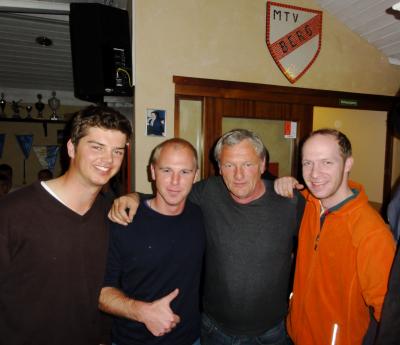 Arm in Arm im a’dabei: Kabarettist Josef Brustmann (3.v.l.) letzte Woche mit den Berger Burschen Tim Lindner, Stefan Groß und Philipp Mehlich (Dank fürs Photo an die Bösen Buben)