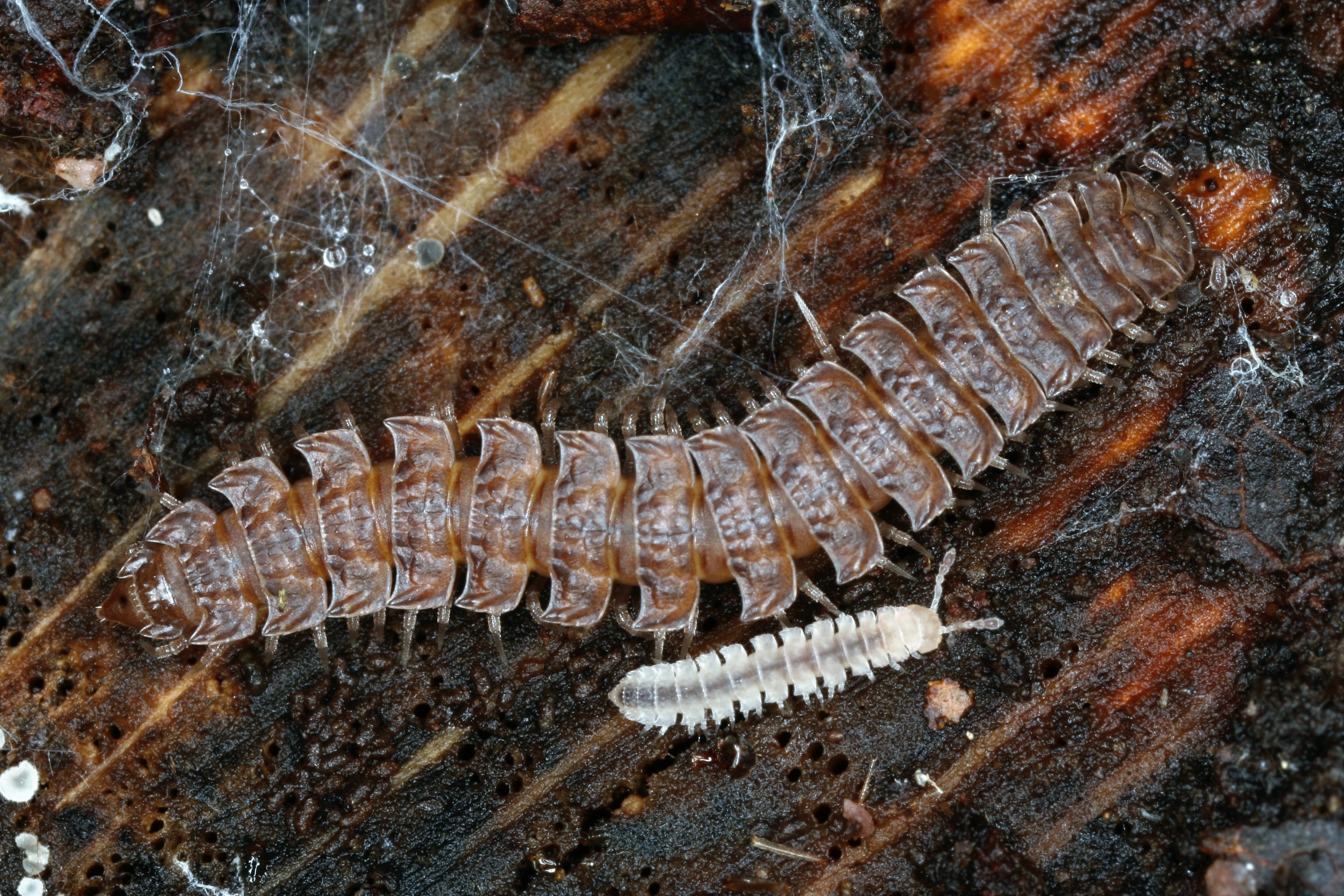 Zwei Tausendfüßler der Art Polydesmus angustus (Rotbrauner Bandfüßer)