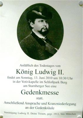 Einerseits hat die Vereinigung “König Ludwig, Deine Treuen”, die 1913 gegründet wurde, an der Votivkapelle einen Gottesdienst angekündigt (10 Uhr 30 Schloßpark Berg), andererseits haben sich die berüchtigten, vermummten Guglmänner zu Wort gemeldet. Nach der Gedenkfeier wollen sie mit Ihrer Aktion “Menetekel” beginnen, die zur Öffnung des Königs-Sarkopharges führen soll und zum Beweis ihrer These, dass der König ermordet worden sei. “Es war Mord!” ist ihr Schlachtruf. Ihre – nicht ganz aktuelle – Internetseite ist: http://www.Guglmann.de/deutsch/index.htm