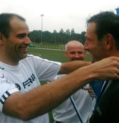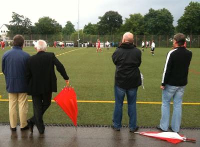 Schon vor der Pause war es ein Spiel auf ein Tor. Nur einmal kam MTV-“Alt-Fußballgott” Christian “Fred” Brunner frei zum Kopfball, verfehlte das gegnerische Tor aber knapp. Ansonsten kombinierten sich die Bayern munter durch die Berger Reihen, wo Abwehrrecke Erich Höhne, Libero (!) Erich Hirt und vor allem Torwart Bernie Hirmer schlimmeres verhinderten. Zusätzliche Brisanz bekam das Spiel von der Seitenlinie aus, wo sich FC-Bayern-Vizepräsident Bernd Rauch eingefunden hatte. Denn der Berger Bernd Rauch ist nicht nur Bayern-Vorstand, sondern auch Mitglied des “MTV-Förderkreises”. Trotzdem war er mit Leib und Seele auf der Seite “seines” FC Bayern.