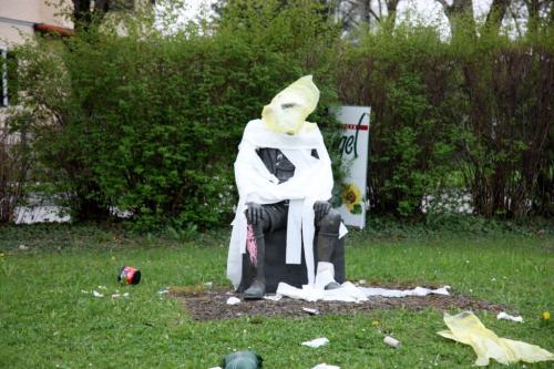 Während in Berg von den Freinachtkabarettisten diesmal auf hintergründige Weise die Themen Nachhaltigkeit und Ortsgestaltung reflektiert wurden, wurde Oskar Maria Graf in Aufkirchen lediglich mit schnödem Klopapier bedacht. Oder soll es eine Hommage an den Verpackungskünstler Christo sein?