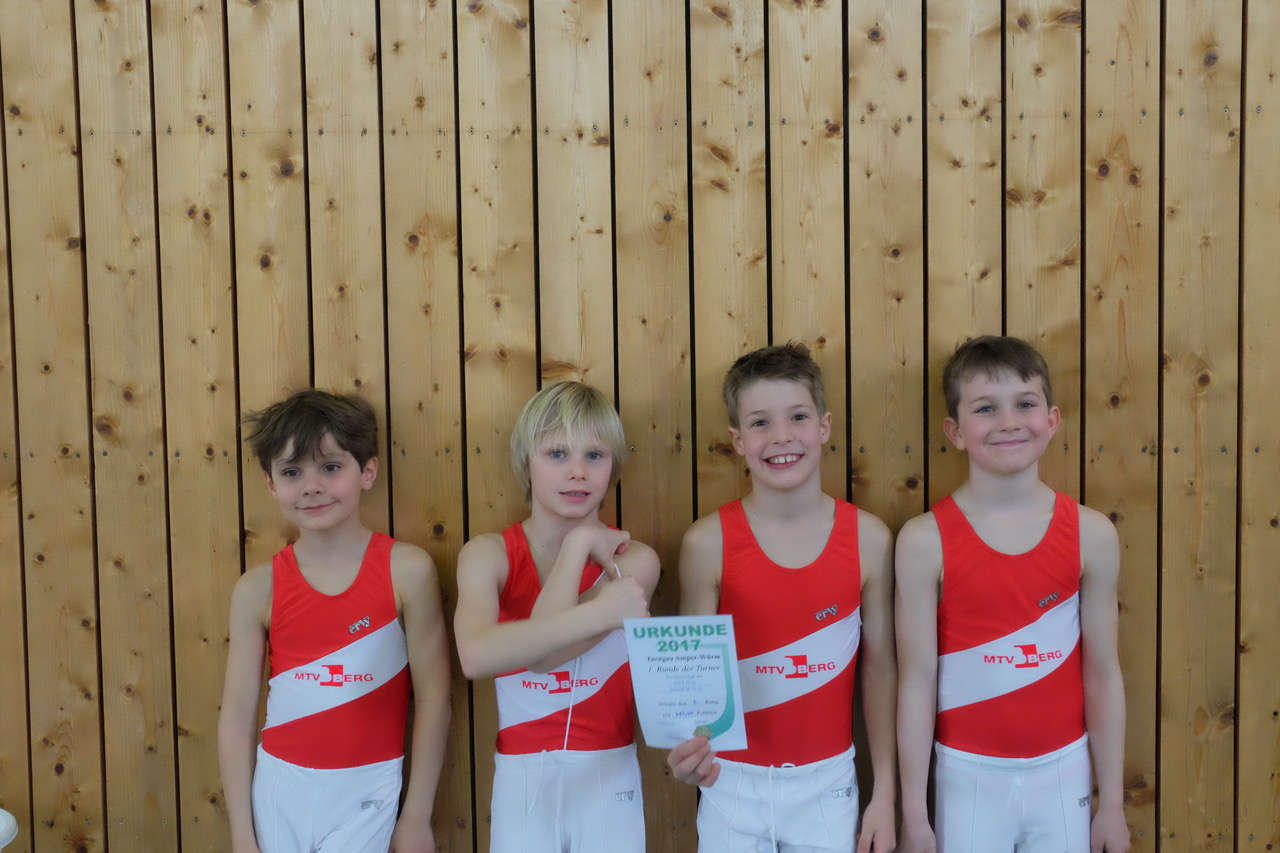 Die Gerätturner des MTV Berg absolvierten am Sonntag, 26. März in Moorenweis eine erfolgreiche 1. Runde des Bayernpokals im Turngau Amper-Würm: Bei den 10-11-Jährigen waren Sebastian Baum, Darwin Müller, Anton Tegge, Julius Rossmann und Xavi Suraj angetreten (Foto). Die kleine und leider verletzungsgeschwächte Mannschaft erreichte Platz 6.