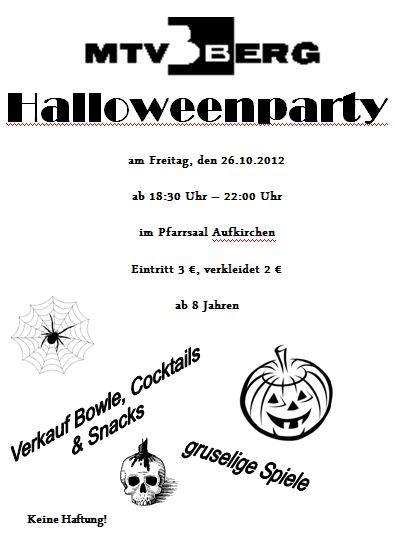 Die Kinder und Jugendlichen ab acht Jahren können heute im Pfarrsaal Aufkirchen Halloween feiern von 18:30 bis 22 Uhr. Der MTV Berg organisiert, der Eintritt kostet 3 Euro, verkleidet nur 2.