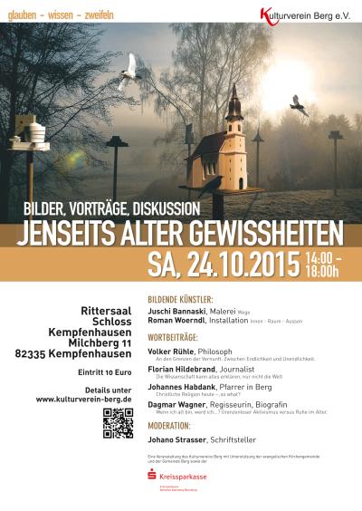 Der Kulturverein Berg und die Kreissparkasse Mücken Starnberg Ebersberg laden für heute von 14 – 18 Uhr zu einer mehrmedialen Veranstaltung. “Jenseits aller Gewissheiten” lautet das Motto, unter dem Juschi Bannaski und Roman Woerndl ausstellen, Volker Rühle (über die Philosophie), Florian Hildebrand (über die Wissenschaft) , Johannes Habdank (über die Religion) und Dagmar Wagner (über das Denken im Alter) diskutieren und vortragen. Moderieren wird Johano Strasser.