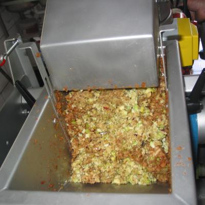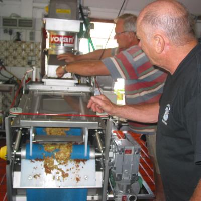 Schritt 5: Die Maische fällt auf das Pressband. Die ausgepresste Maische wird ausgeworfen und von Jägern und Landwirten als Futter für ihre Tiere abgeholt.