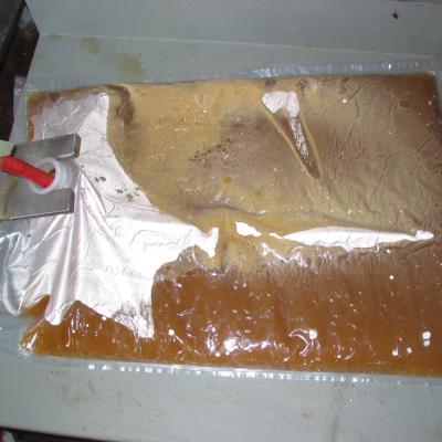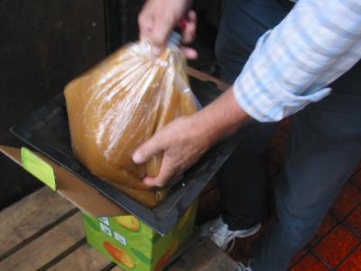 Schritt 10: Nun wird er in Beutel abgefüllt, die mit einem Kugelventil verschlossen sind. Das heißt, der Saft kann herausfließen, ohne dass Luft eindringt. 9,7 kg entsprechen genau 10 Litern, Apfelsaft ist nämlich schwerer als Wasser.
