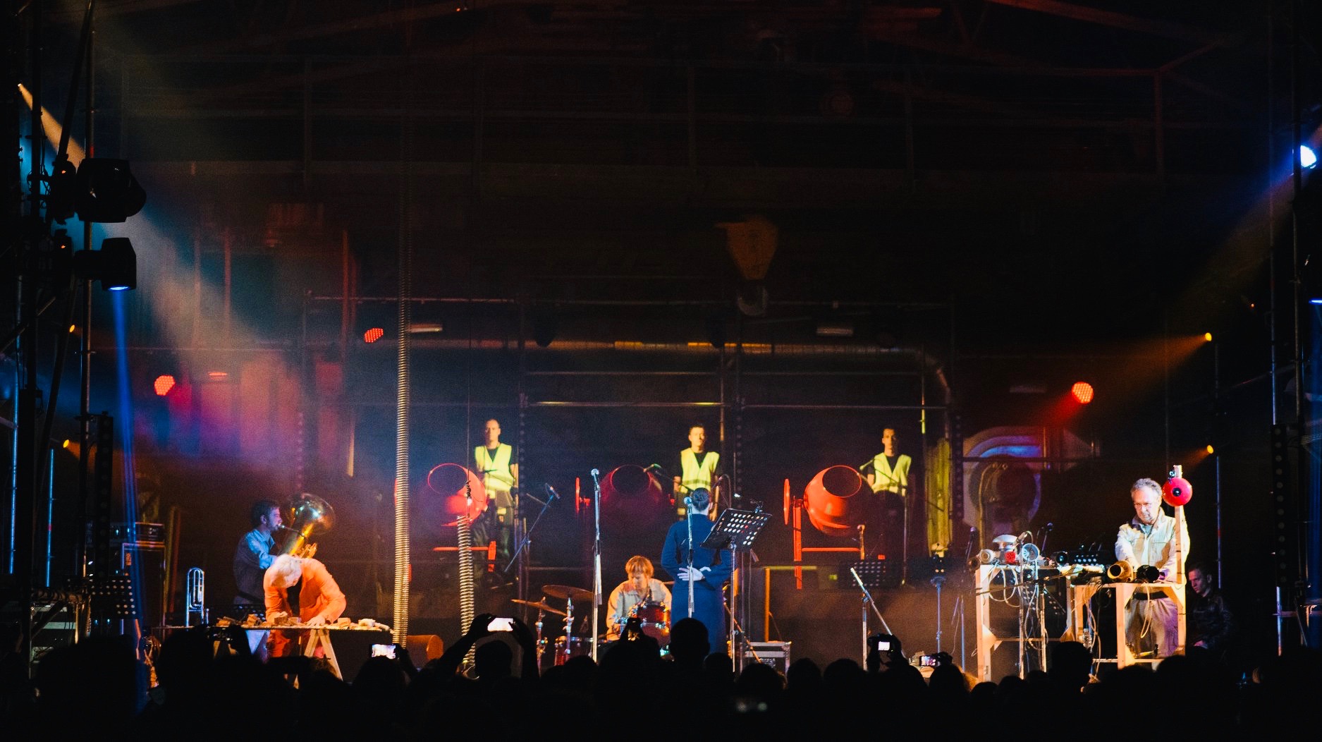 Ammer & Einheit spielen “Hammerschlag” in Perm, links im orangen Overall FM Einheit, rechts an den Sirenen Andreas Ammer