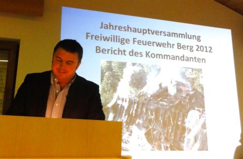Harte Fakten, harte Zahlen: Der Bericht des Kommandanten Tobi Völkl enthielt alles über Einsätze, Übungen, Lehrgänge, Leistungsprüfungen und aufgewendete Stundenzahlen. Die FFW Berg wurde 2012 zu 78 Einsätzen gerufen – 12 Brände – darunter der Großbrand in Kempfenhausen, 44 Hilfeleistungseinsätze, 1 Sicherheitswache und 21 Fehlalarme. Acht Menschen wurden gerettet, in einem Fall kam jede Hilfe zu spät – auch dies etwas, was es zu verarbeiten gilt.