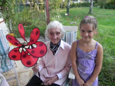 Ganz ohne Genehmigung wurde gestern hinter dem Rathaus heimlich ein Windrad aufgestellt: Cosima P. gratulierte Erika Schwarzmann damit zum 100. Geburtstag – wir schließen uns an!