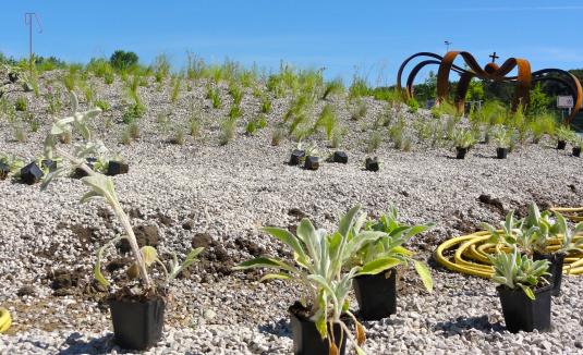 Die Bepflanzung, die Ulrike Adldinger selbst noch nicht ganz optimal findet, wird noch wachsen und gedeihen. Derzeit erinnert sie – historisch nicht unrichtig – etwas an die Wüste aus Karl Mays Meisterwerk “Der Geist des Llano Estacado” oder an ein Nietzsche-Gedicht.