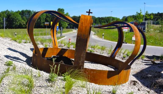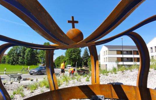 Das Bild vom “Kreisel dieser Woche” nähert sich endlich in Rekordzeit dem Erscheinungsbild des Kreisels in alsbald jeder Woche. Zur Stunde wird am Kreisverkehr in Berg die Krone von Roman Wörndl (Aufkirchen) nach einem Entwurf von Ulrike Adldinger (Höhenrain) aufgestellt.