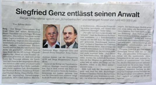 Die Zeitung berichtet, dass der Berger Unternehmer von der Maxhöhe die Zusammenarbeit mit seinem Anwalt beendet habe. Die “rechtliche Beratung” durch Veauthier hat auch nach Berg viel Unfrieden und einzelnen Bürgern und Institutionen zahlreiche, kosten- und nervenintensive Rechtsstreitigkeiten gebracht. Genützt hat sie keinem (bzw. nur einem). Laut SZ habe Dipl.Ing Dr. h.c. Siegfried Genz seinem Anwalt mitgeteilt, dass dessen Strategie “ringsum alles anzuzünden” sich “zu einem gefährlichen, nahezu unlöschbaren Flächenbrand” entwickelt habe. Genz erachte die Veauthier’sche “Mission als gescheitert” und sehe sich vor einem “Scherbenhaufen” stehen. 400.000 € hätten die Bemühungen seines Anwaltes den Kaufmann bislang gekostet: “Für sehr viel Geld habe ich sehr viel verloren!” sei das Resümee des Briefes.