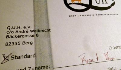 Jetzt wurde der Hintergrund dieser Entwicklungen deutlich: Mit Wirkung zum gestrigen Quartalsende ist BM Monn aus der EUW aus- und in die QUH eingetreten. Mit den Worten: “Es ist phantastisch, was die QUH in den letzten Jahren für unsere Gemeinde geleistet hat!” unterzeichnete BM Monn seinen Mitgliedsantrag (für Nachahmer, der Download hier: ). Eine Sonderbehandlung wird er in der QUH vorerst nicht bekommen. Er erhielt die laufende Mitgliedsnummer 123.