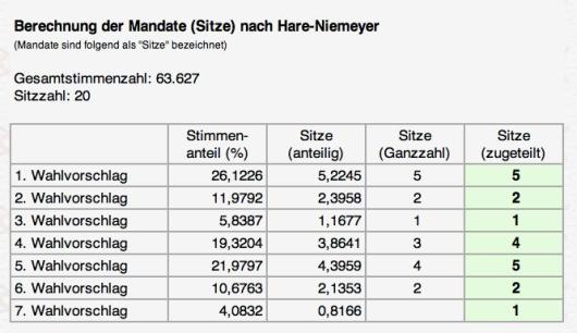 Trägt man in einen Wahlrechner (z.B. http://www.wahlauswertung.de/probewahl/sitzverteilung ) bei der QUH statt den wirklich ausgezählten 13.971 Stimmen 14 Stimmen mehr ein, nämlich 13.985, erhält die QUH 5 Mandate, die SPD nur 2 (zur Erinnerung: jeder Wähler hatte 20 Stimmen zu verteilen).