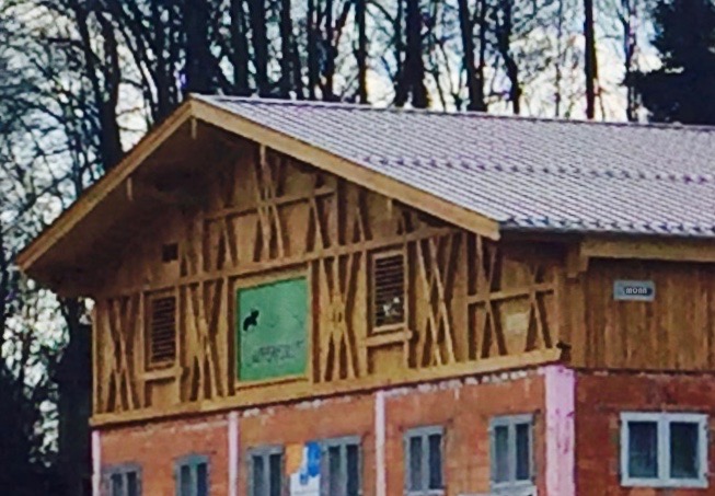 Nicht ganz unumstritten dürfte es sein, dass das in Holzbauweise ausgeführte “bayrische Penthouse” im zweiten Obergeschoß des Gebäudes für den in 3 Jahren scheidenden Bürgermeister als Wohnung reserviert worden ist. Mit scharfen Auge kann man auf dem unteren Bild auf dem kleinen weißen Schild rechts an der Wand den Namen “MONN” erkennen.
