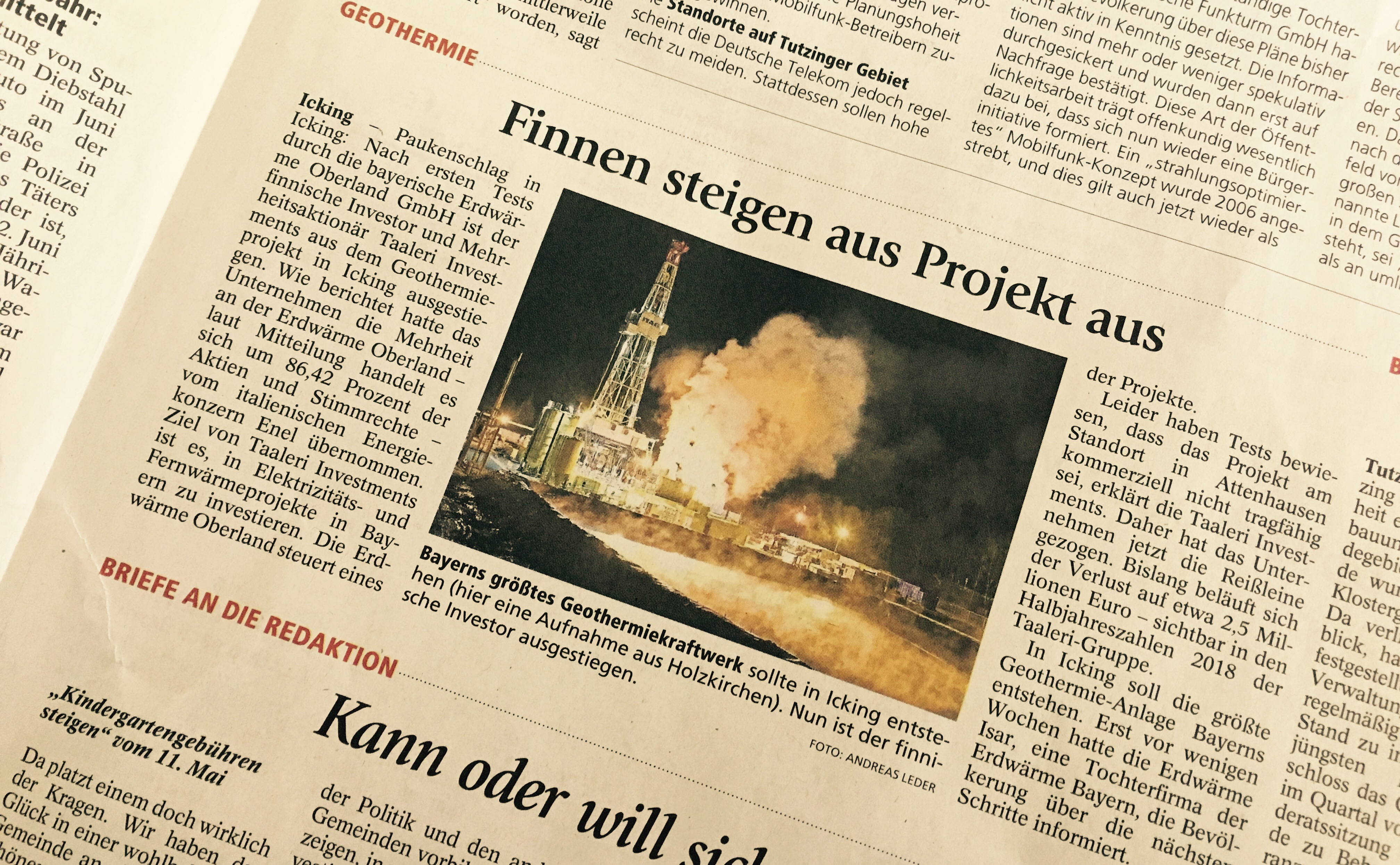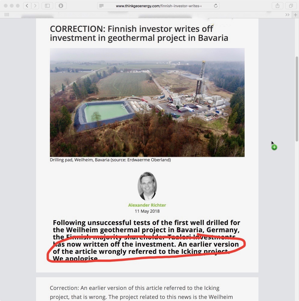 Auch in der Online-Ausgabe hält sich diese Falschmeldung bereits seit gut einem Tag: https://www.merkur.de/lokales/wolfratshausen/icking-ort28838/icking-finnen-steigen-aus-geothermie-projekt-aus-9864154.html . Hereingefallen sind die Kollegen offenbar auf einen Bericht des digitalen Fachorgans “Thinkgeoenergy.com”, die in lokaler Unkenntnis das Ickinger Großprojekt mit dem schon seit längerer Zeit abgeschriebenen Weilheimer Vorhaben verwechselt hatten. Die Internetseite hat ihren Fehler inzwischen korrigiert.