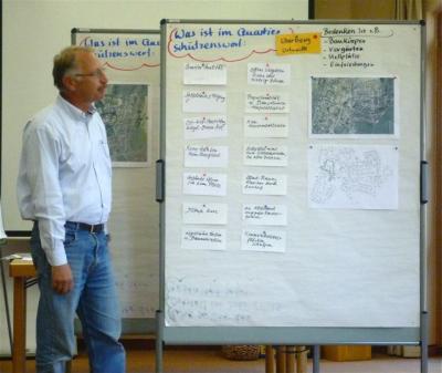 Rückblick auf Obing: GR Brunnhuber referiert die Ergebnisse der Arbeitsgruppe zur “Ortsmitte Berg”.