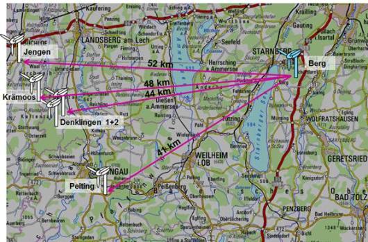 “Die Fa. RSC GmbH, Dr. Guttenberger, hat in 2012 vom 09.Mai bis 30.September Windmessungen (LIDAR) im Projektgebiet ausgeführt. Die Messungen liefern Winddaten in den Höhen zwischen 40 und 200 m in 10m-Schritten. Diese Messungen wurden mit den Betriebsdaten (Windgeschwindigkeit, Windrichtung, etc.) von fünf in Hauptwindrichtung vorgelagerten WEAs wie Denklingen 1 (Datensatz über 9 Jahre), Denklingen 2 (Datensatz über 8 Jahre), Krämoos (Datensatz über 2 Jahre), Peiting (Datensatz über 10 Jahre) und Jengen (Datensatz über 9 Jahre) verglichen und in Relation gesetzt (siehe Abbildung unten). Daraus und mit Hilfe der Langzeitdaten (MERRA-Daten der NASA) über den Zeitraum 1992 bis 2012 (20 Jahre) wurde dann der Ertrag am Standort Berg, Wadlhauser Gräben über eine Modellsimulation berechnet. Der TÜV-Süd hat im Übrigen auf gleichem Wege das erste Gutachten erstellt.