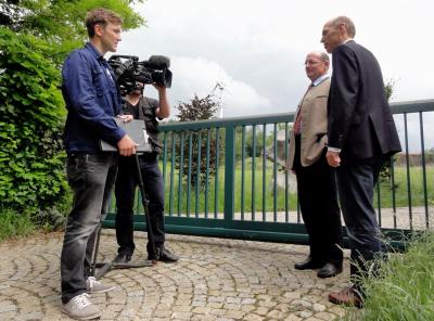 Dreharbeiten vor dem Windrad: das quer-Team mit BGM Monn und Kreisbaumeister Dr. Kühnel