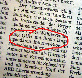 Für dieses Blog war die letzte Woche eine gute Woche. Die Artikel über den MTV-Trainigsplatz und das Kindergartengeld (nach unten scrollen) vermeldeten jeweils dreistellige Besucherzahlen. Heute lobt der Münchner Merkur die QUH in seiner Wochenendausgabe für ihren “längst legendären Internet-Blog”.
