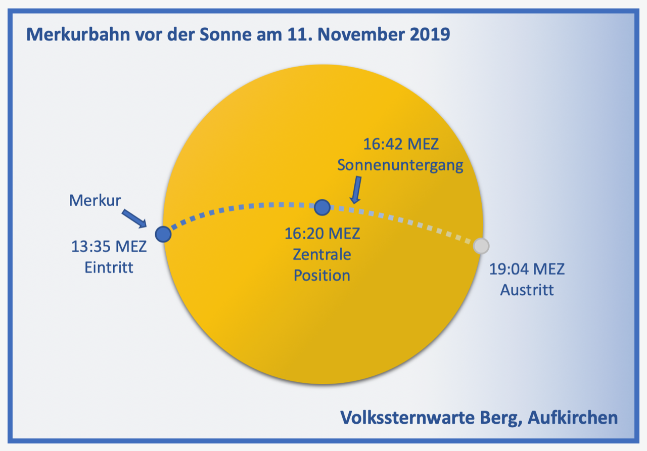 Gleichzeitig mit dem Faschingsbeginn und dem Martinstag heute, am 11.11., gibt es am Nachmittag ein astronomisches „Schmankerl“ auf der Berger Sternwarte zu sehen: einen Merkurtransit! Was für ein Glück, dass wir so ein Juwel wie die Sternwarte in unserer Gemeinde haben – nun heißt es Daumen drücken, dass das Wetter mitspielt …