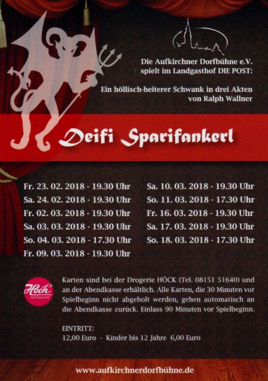 Die Geschichte um Senta, Bertl, Stutz und Luzifers Sparifankerl alias Lucki ist ein Schwank in drei Akten aus der Feder von Ralph Wallner. Wir sind gespannt, was die Aufkirchner Dorfbühne daraus macht und wünschen für die Premiere schon mal toi toi toi.